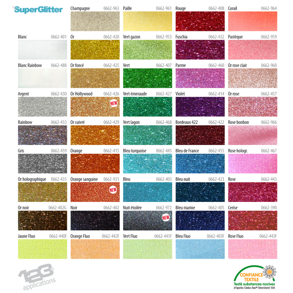 Le SuperGlitter est un flex textile ultra pailleté dont les paillettes en relief scintillent à la lumière. Il se distingue de l'EcoFlex pailleté, qui lui est lisse au toucher.