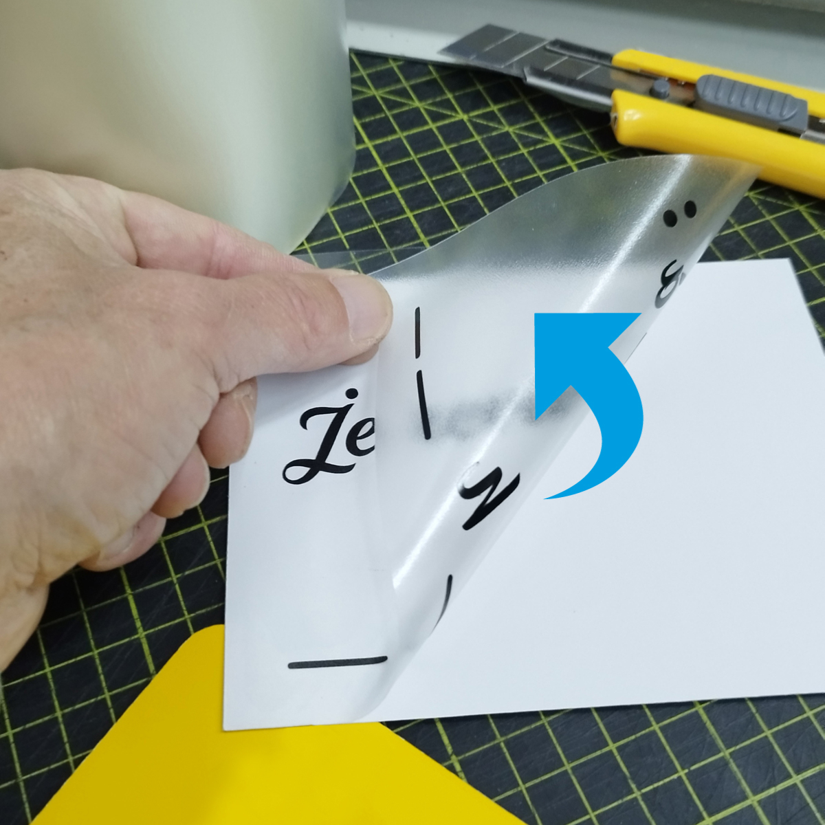 Le tape de repositionnement, ou tape transfert, est un adhésif indispensable pour appliquer un visuel à découpes multiples (lettres séparées par exemple) sur son support final. Une fois le visuel découpé et échenillé, il suffit d'appliquer le tape transfert par dessus à l'aide d'une raclette : cela permet de décoller le visuel de sa dorsale d'un seul tenant, en conservant tous les éléments séparés. L'ensemble peut ensuite être positionné facilement sur le support final, et le tape transfert sera enfin retiré après l'application.